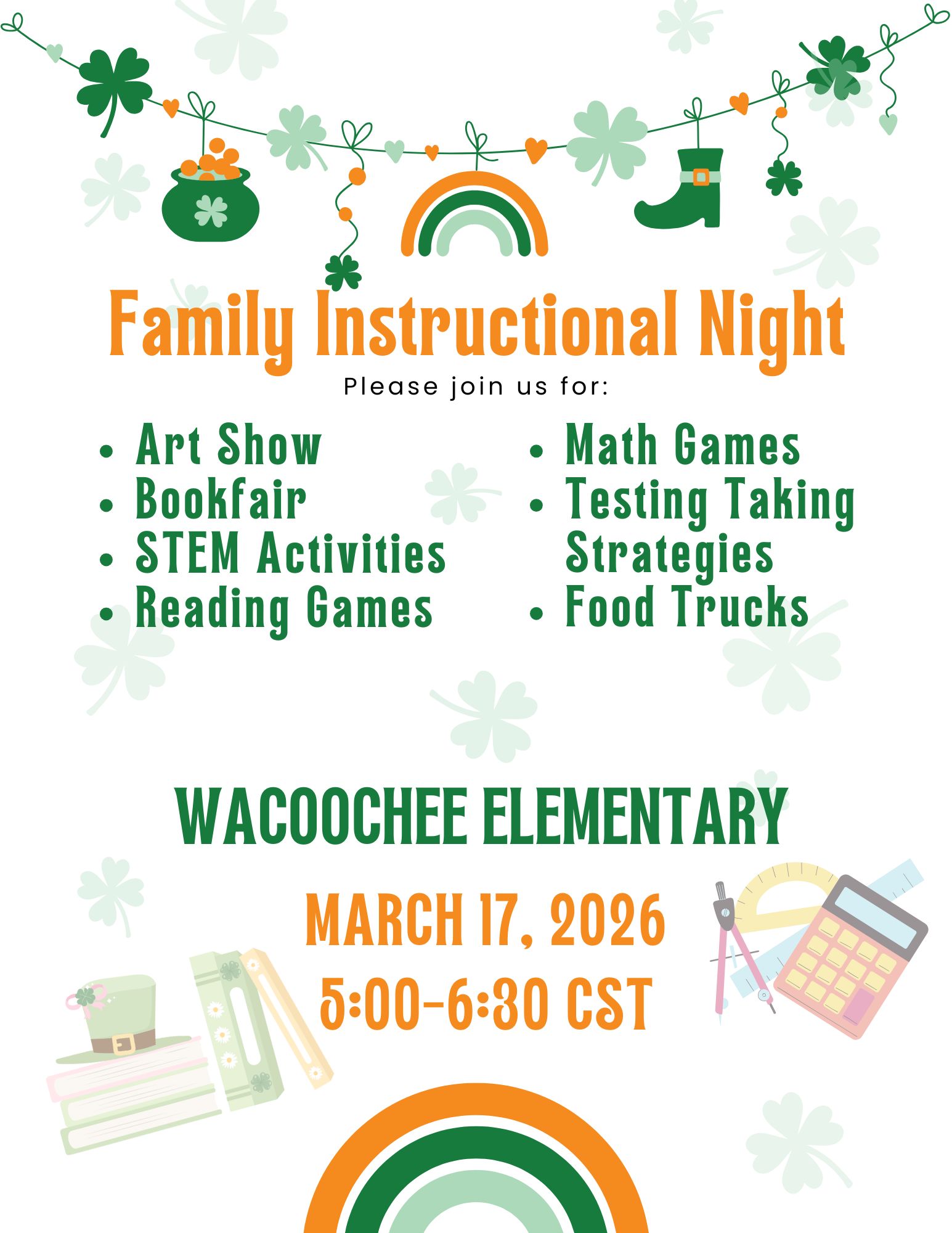 Join Us for Family Instructional Night! Wacoochee Elementary families, we invite you to join us for a fun and engaging Family Instructional Night on Tuesday, March 17, 2026, from 5:00–6:30 PM CST!This will be a wonderful opportunity for ... March 9, 2026